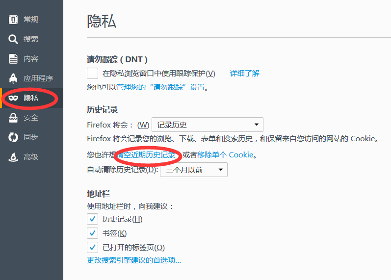 2.4.2 选择"隐私",点击"清空近期历史记录"