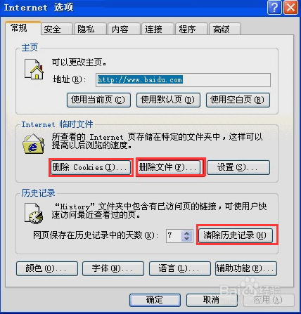 2.1.2 在INTERNET选项界面,点击“删除文件”和“删除COIKIE”和“清空历史记录”按钮,按提示确定就好了。最后点击最下面的“应用”按钮,再点击“确认”按钮即可